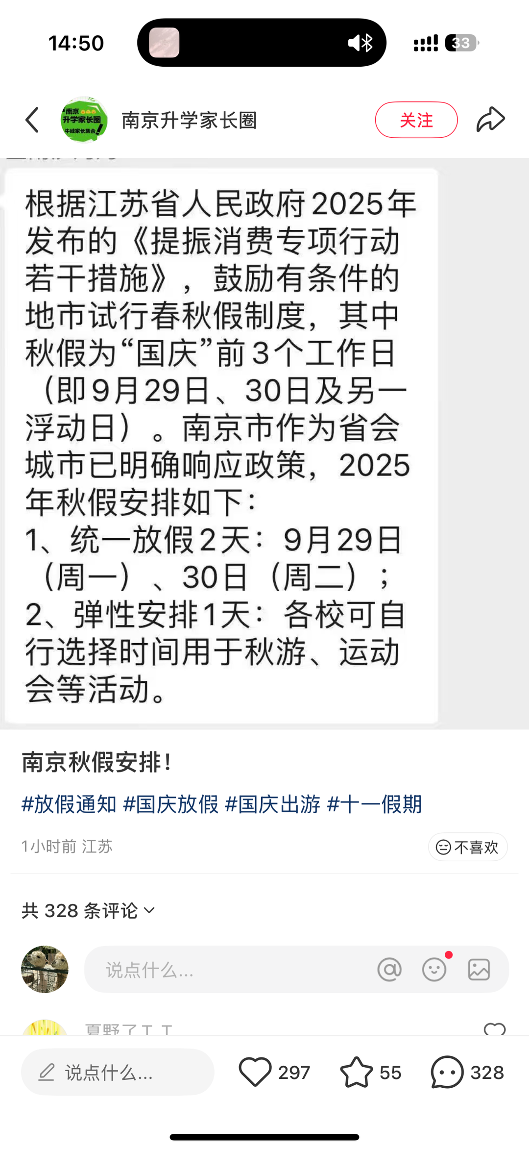 网上有消息称,南京市作为省会城市已明确响应政策,2025年秋假安排如下:1、统一放假2天:9月29日(周一)、30日(周二);2、弹性安排1天:各校可自行选择时间用于秋游、运动会等活动。