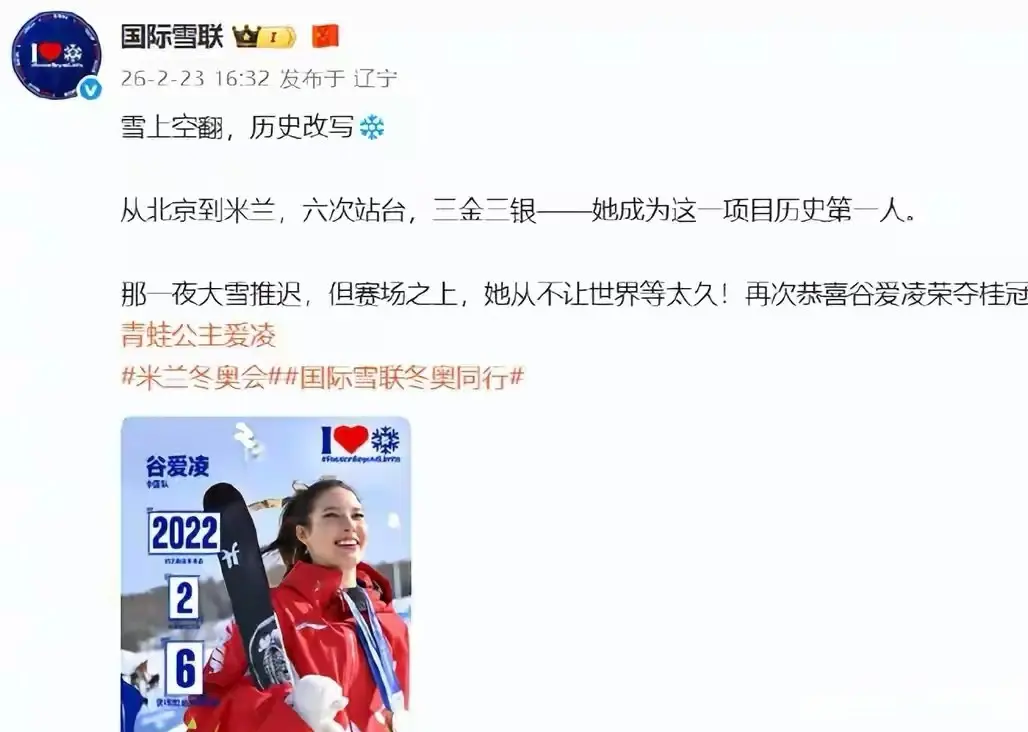 2月23日,国际雪联发文盛赞谷爱凌“从北京到米兰,六次站台,三金三银﹣﹣她成为这一项目历史第一人。”