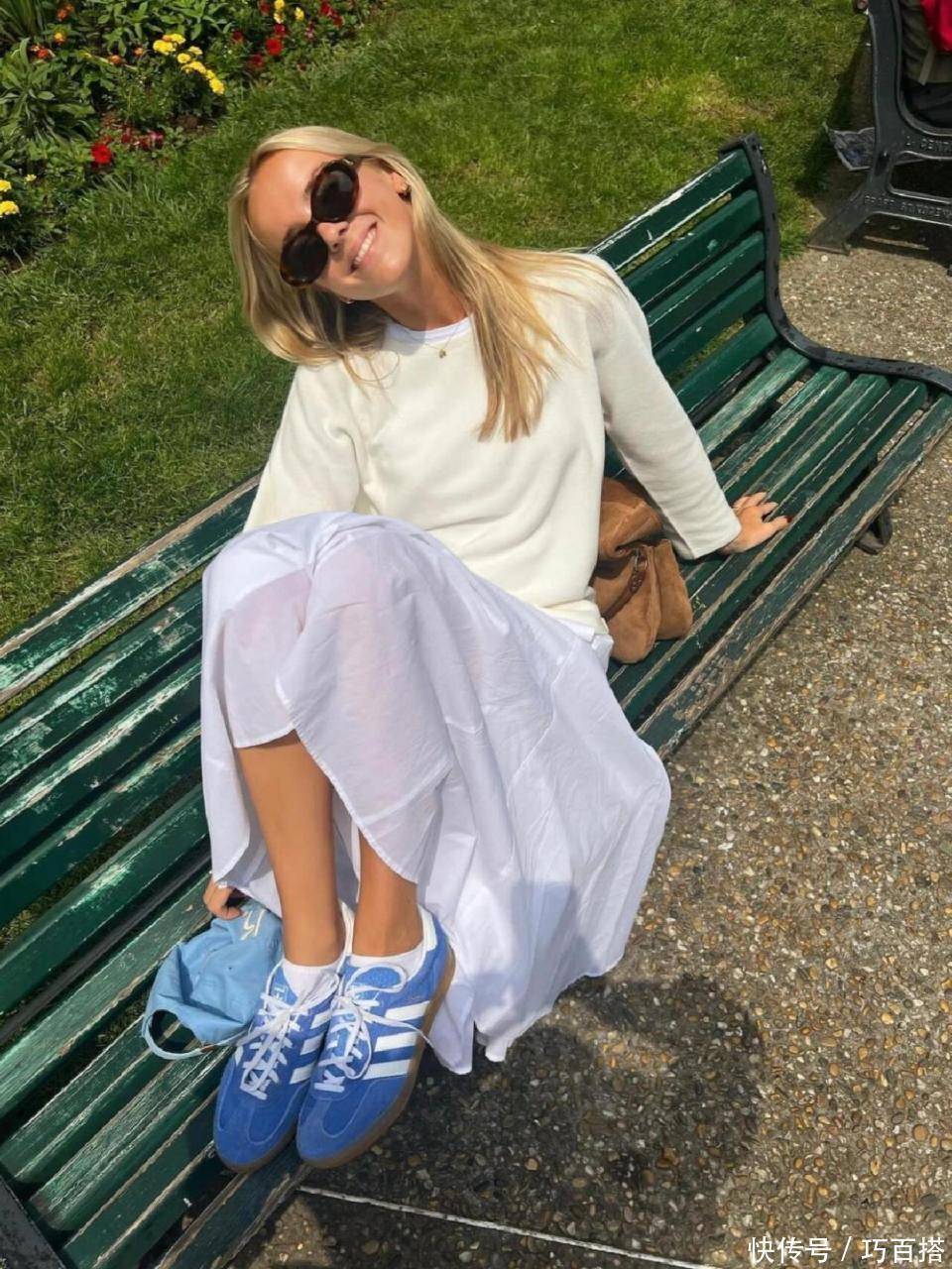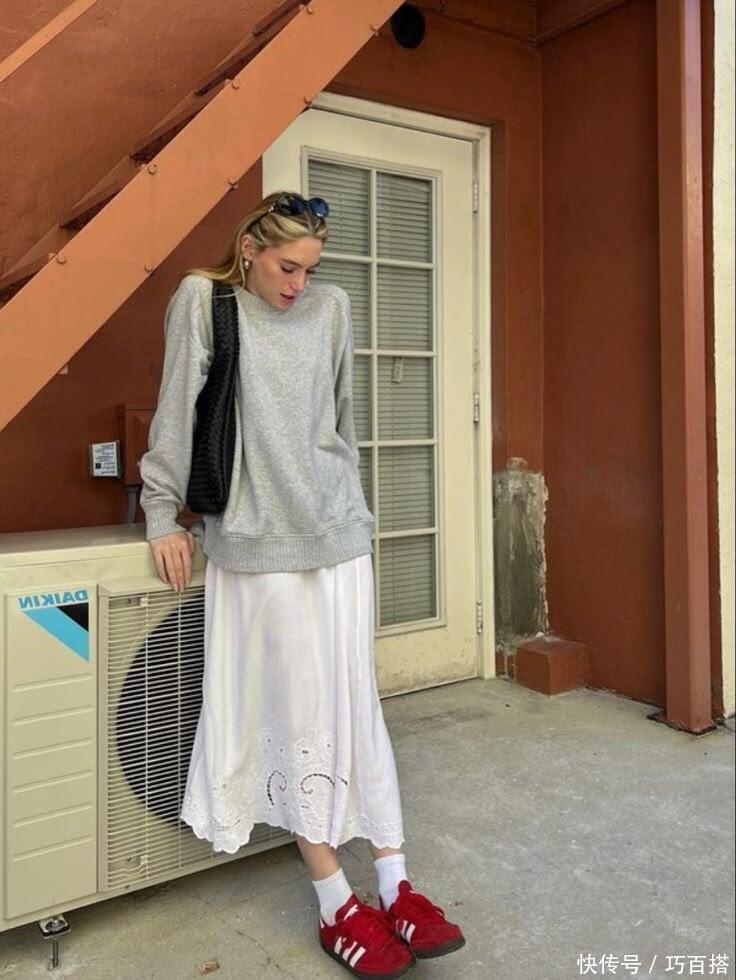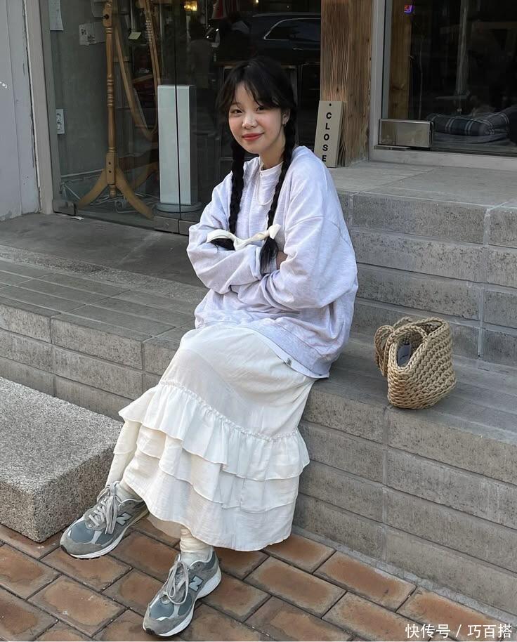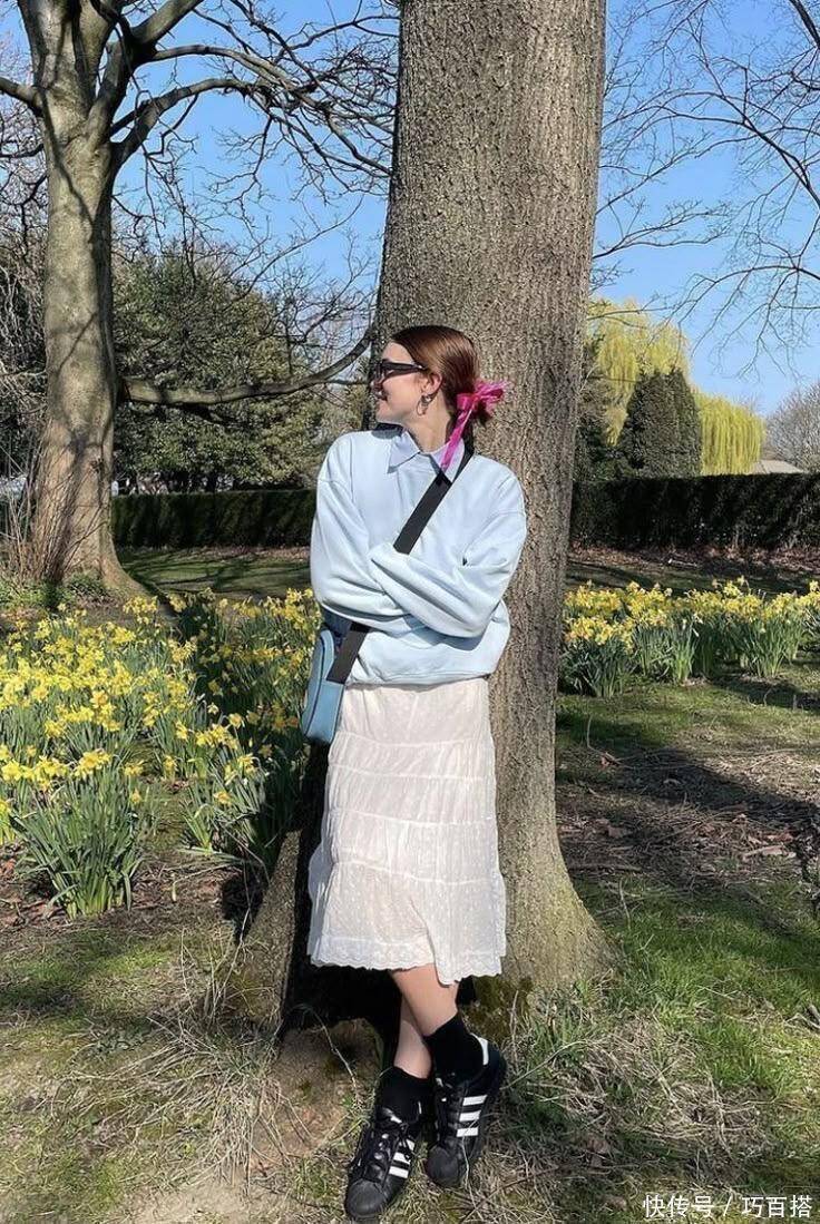 首先,从小白裙呈现氛围以及春天主流风格来说,在挑选与之搭配的上衣时,尽量以浅色系为主,唯美浪漫又有少女氛围,清新减龄又不会让人觉得轻挑,与花灰色卫衣搭配,学院风满满,麻花辫和运动鞋都是最佳助力,学生党这样穿简直无敌。