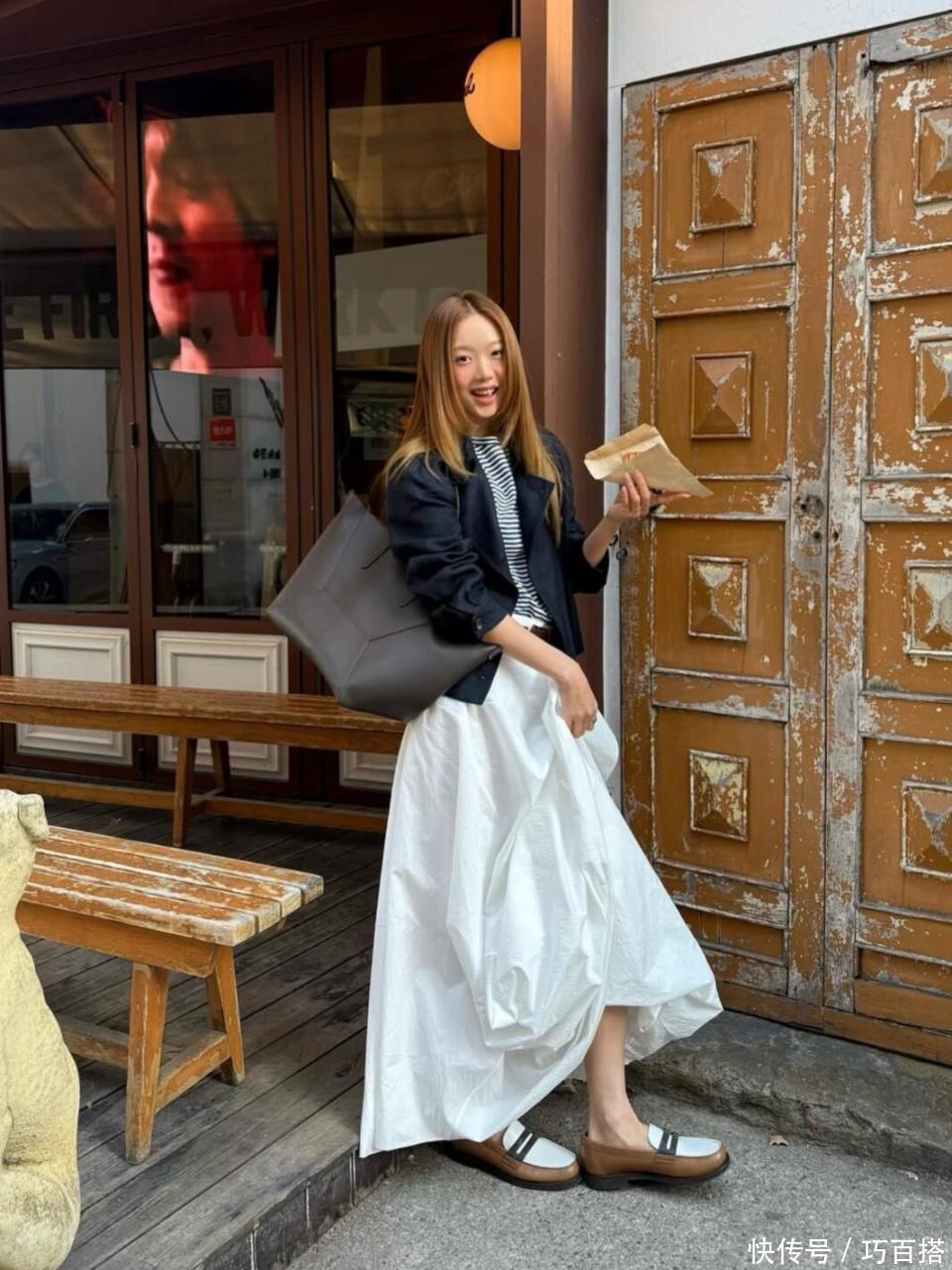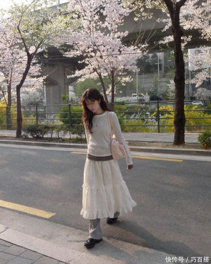 喜欢轻熟唯美风格的姐妹,可以借鉴博主身上这套造型,纯白色半裙换成米白色半裙,上衣选择假两件的修身款上衣,两者搭配软糯不甜腻,既有层次又高级。