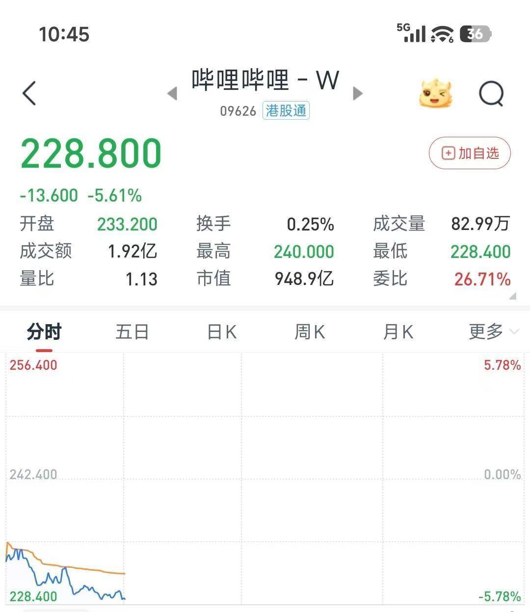 2月20日是港股马年春节后首个交易日。B站-W(09626.HK)早盘一度跌近5%,截至10:45,大跌5.61%,报228.8港元/股。