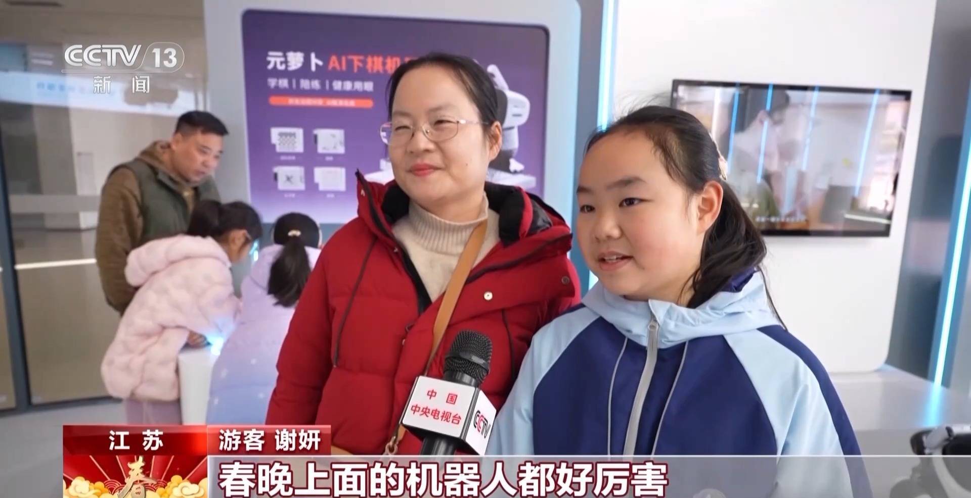 游客 谢妍:春晚上面的机器人都好厉害,会后空翻还会武术。听说这边也有,妈妈就带着我来看看。我喜欢会下棋的,还有写字的,感觉科技真的很神奇。